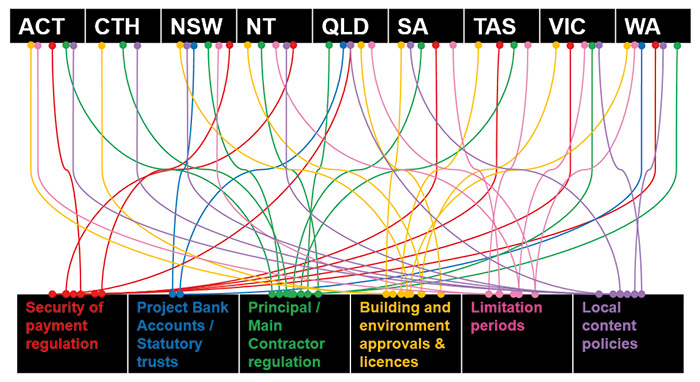 This paper discusses a number of key issues that international contractors should be aware of across all phases of the project lifecycle from tender phase to delivery phase, as well as powerful remedies available in certain types of project-related disputes. Common themes emerge in the paper. Most prominent is the impact of Australia’s nine jurisdictions, each with wide-spanning and subtly different regulatory regimes, the complexity of which is demonstrated in the below graphic: