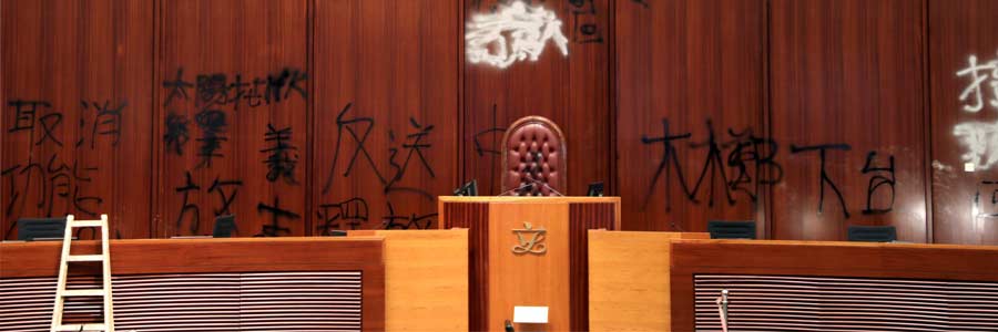 Damages inside the Legislative Council building in Hong Kong after protesters stormed it during a demonstration on the anniversary of Hong Kong’s handover to China, 3 July 2019. REUTERS/Jorge Silva
