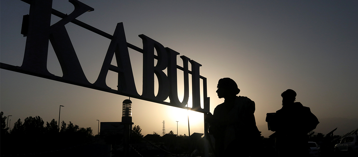 Image credit: Taliban soldiers stand in front of a sign at the international airport in Kabul, Afghanistan, September 9, 2021. www.pictures.reuters.com