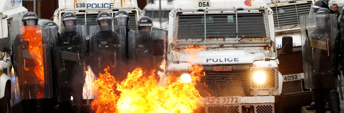 Header pic: Protestors clash with police on the Springfield Road in Belfast, Northern Ireland, 8 April 2021. REUTERS/Jason Cairnduff TPX