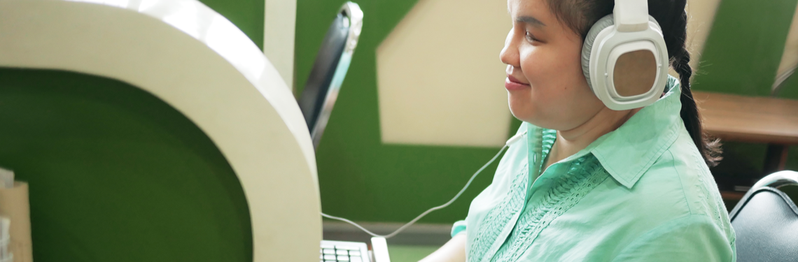 Image: Disabled young blind woman at workplace. Chansom Pantip/Shutterstock.com