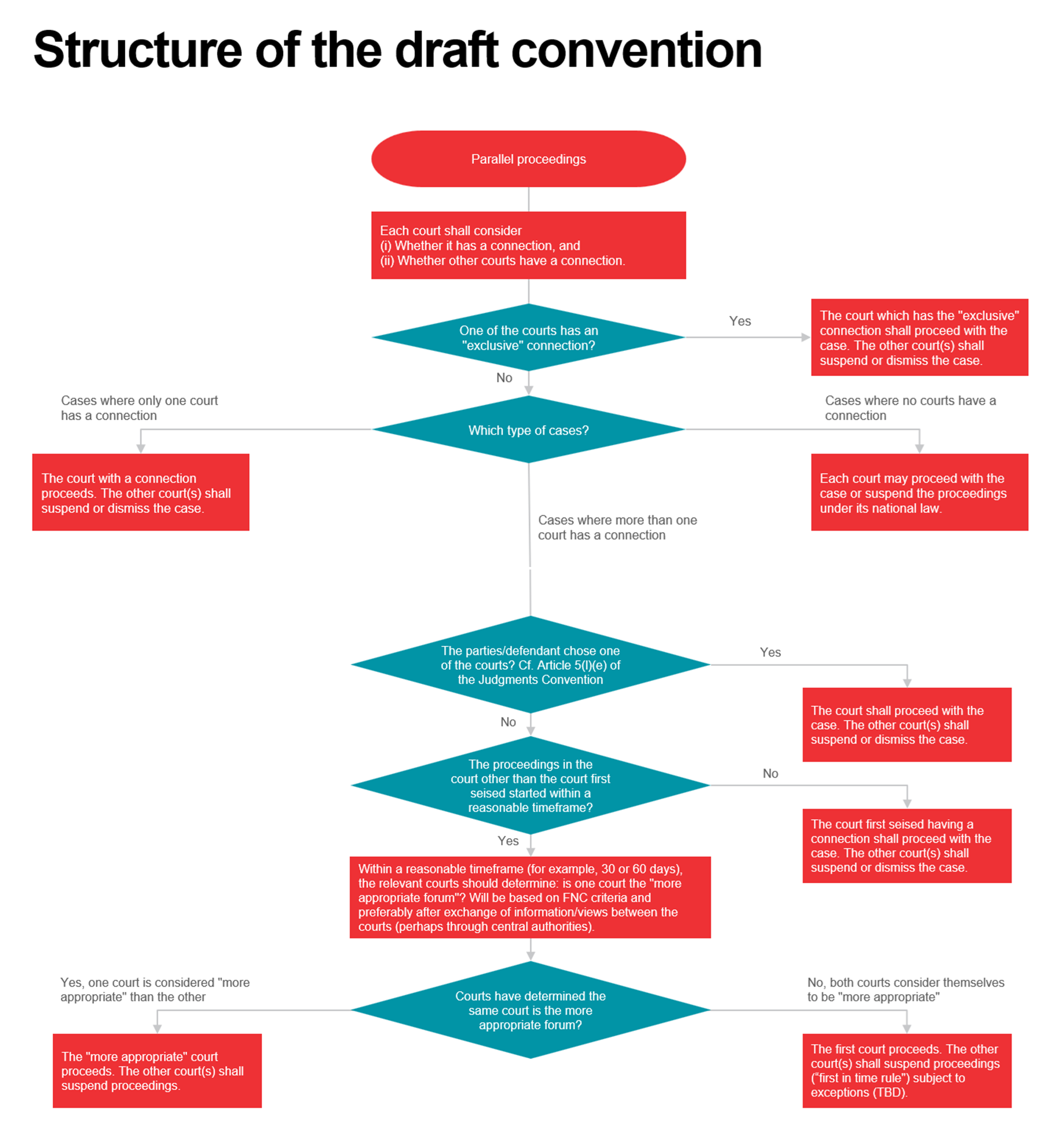 Roe presented a flow chart illustrating the proposed mechanism, which synthesises civil law (first-in-time rule) and common law (forum non conveniens) traditions. The process involves: