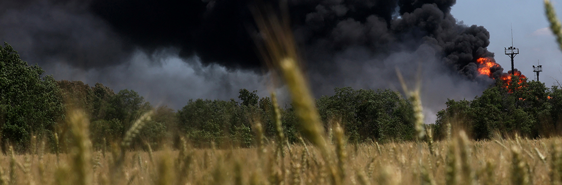 Image credit: A fire from a gas processing plant continues to burn behind a field of wheat after the plant was hit by shelling a few days prior in Andriivka in the Kharkiv region as Russia's attack on Ukraine continues in Ukraine, June 21, 2022. REUTERS/Leah Millis