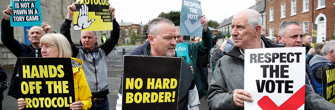 Image credit: Anti-Brexit group protest at entrance to Hillsborough Castle before the arrival of British Prime Minister Boris Johnson, in Hillsborough, Northern Ireland, 16 May 2022. REUTERS/Peter Nicholls