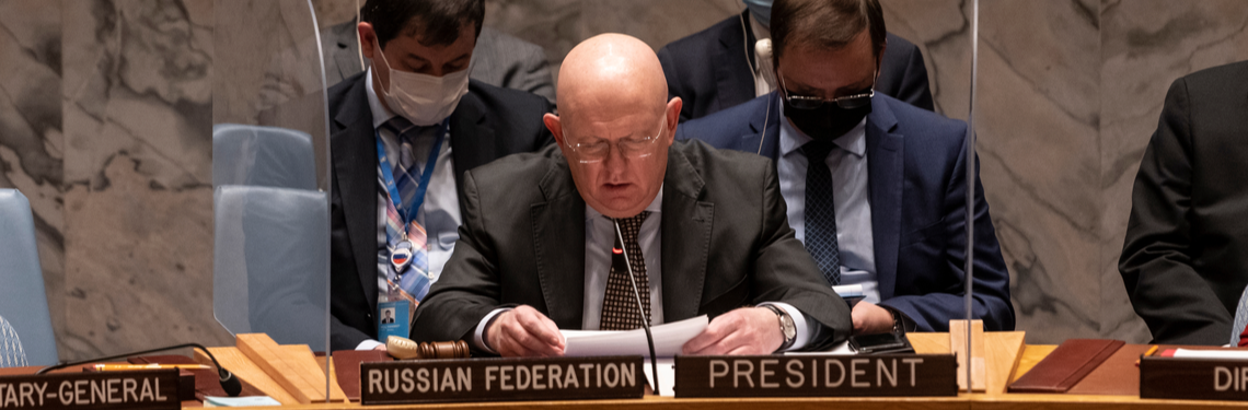 Image: Russian Ambassador Vassily Nebenzia speaks during Security Council meeting and vote on resolution on Russian aggression on Ukraine at UN Headquarters. 26 February 2022. lev radin/Shutterstock.com