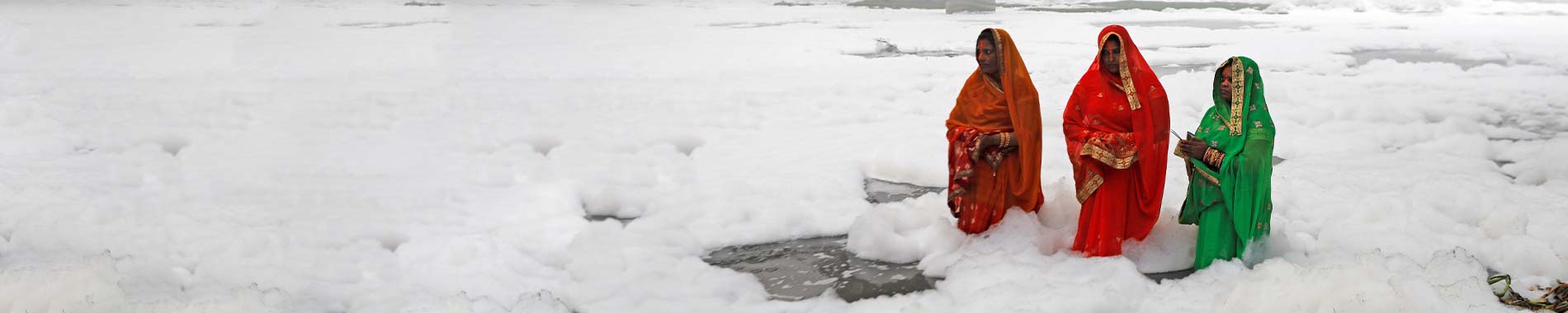 Hindu women worship the sun god in the polluted waters of the Yamuna river during the Hindu religious festival of Chhath Puja in New Delhi, India, 3 November 2019. REUTERS/Adnan Abidi