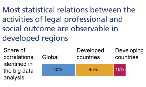 For the purposes of the Report, social impact is grouped into five areas based on common themes across the UN Social Development Goals (SDGs): peace, justice and institutional strength; equality and inclusion; education; environmental sustainability; and health and wellbeing. ‘The relationship between the work of legal professionals and social development is confirmed by numerous statistical links between indicators of activities of legal professionals and indicators of SDG progress’, reads the Report. Further, ‘almost 70 percent of the correlations identified in this report’s big data analysis links to areas of social, rather than economic, impact and are relatively evenly distributed among the five areas of social impact. For example, the higher the access to legal aid within a country, the lower the levels of income inequality within its population’.