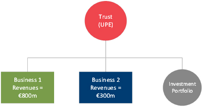 Although the trust may not prepare financial statements, if it was required to do so it is likely that it would consolidate all the other entities. For GloBE purposes the trust is therefore the UPE of a single MNE Group. That has the effect of bringing both Business 2 (which, looked at in isolation, has revenues below the €750m threshold) and the investment portfolio into scope of the Rules and potentially subjecting them to top-up tax.