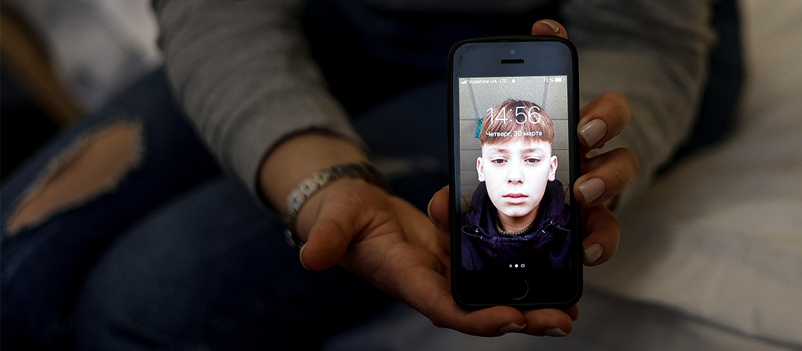 Alla Yatsentiuk shows a picture of her 14-year-old son Danylo, who went to a Russian-organised summer camp from non-government controlled territories and was then taken to Russia, as she speaks with Reuters before travelling to take Danylo back, at a volunteer centre in Kyiv, Ukraine March 30, 2023. REUTERS/Valentyn Ogirenko.